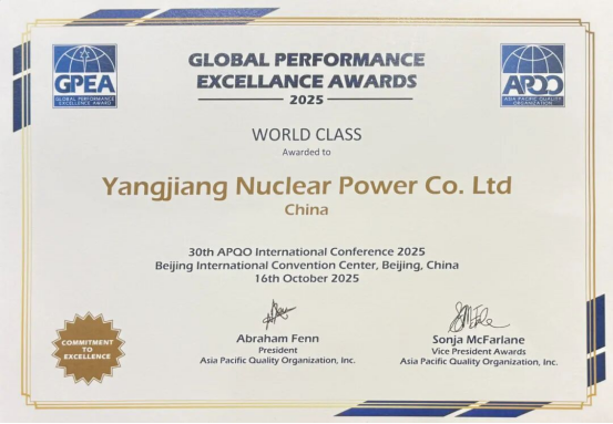 亞太質量組織涵蓋中、美、日、澳等60余個國家和地區的質量組織,其頒發的“全球卓越績效獎”是國際管理領域的權威認可,也是亞太質量組織授予的最高榮譽。獎項面向全球追求卓越管理的組織,以國際通用的卓越績效標準為評價依據,每年評選一次,設置“世界級”“業內最佳”“追求卓越”三個層級,申請門檻需先獲成員國國家級質量獎。此次榮譽,是陽江核電繼2023年獲得第二十屆全國質量獎后,實現“國獎”到“國際獎”的進階。