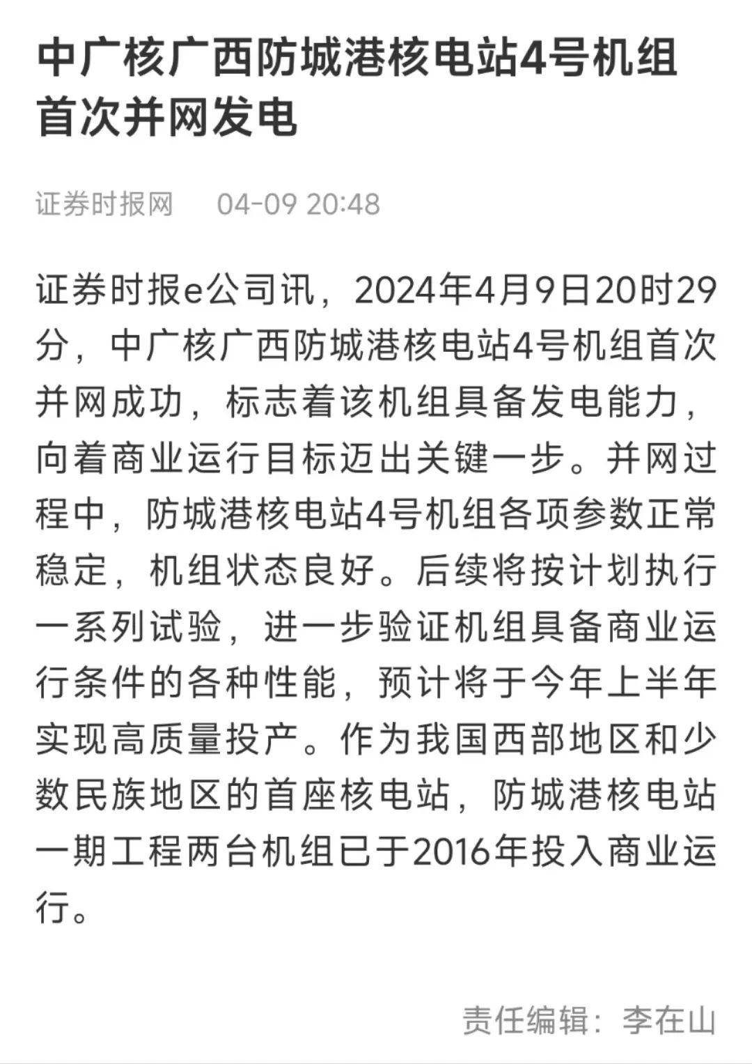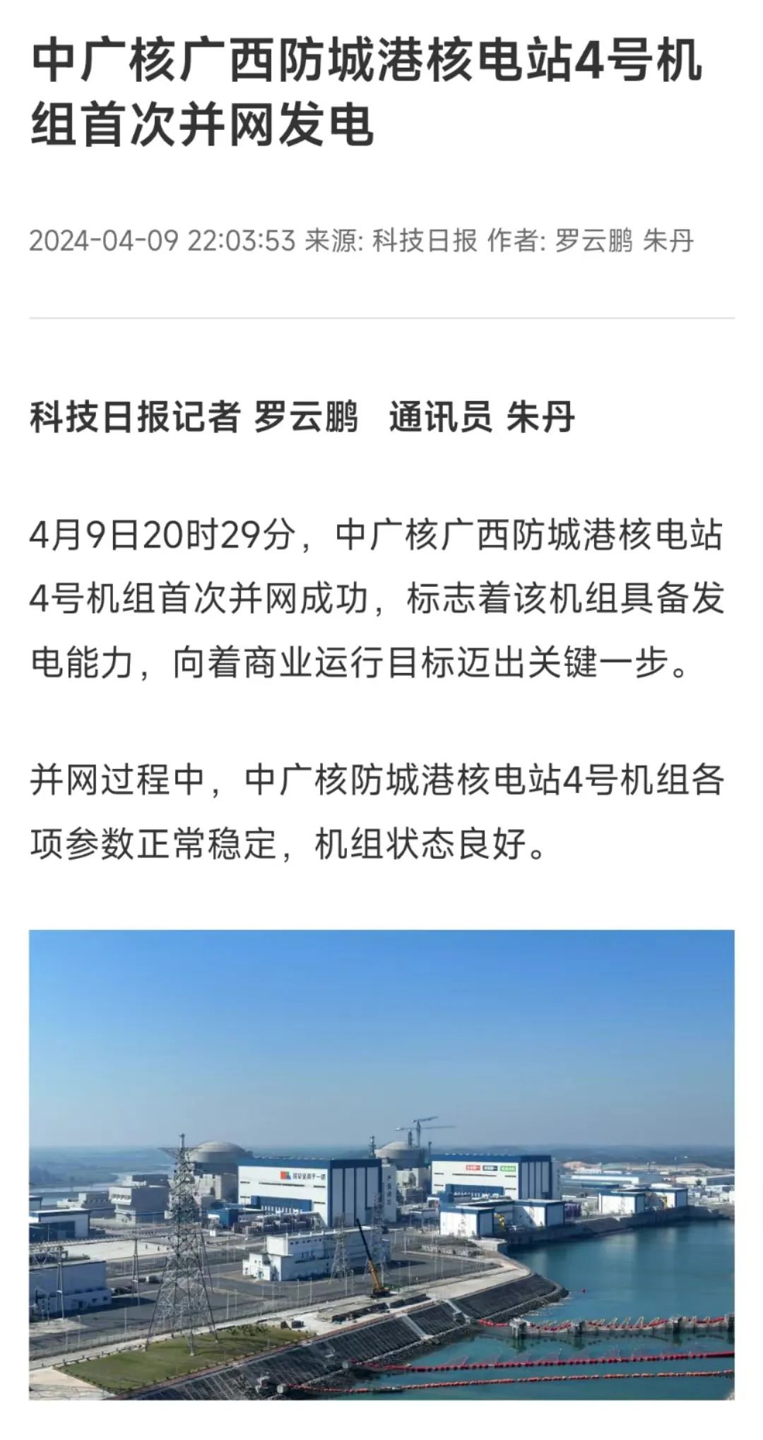 4月9日20時29分,中廣核廣西防城港核電站4號機組首次并網(wǎng)成功,標志著該機組具備發(fā)電能力,向著商業(yè)運行目標又邁出了關鍵一步。