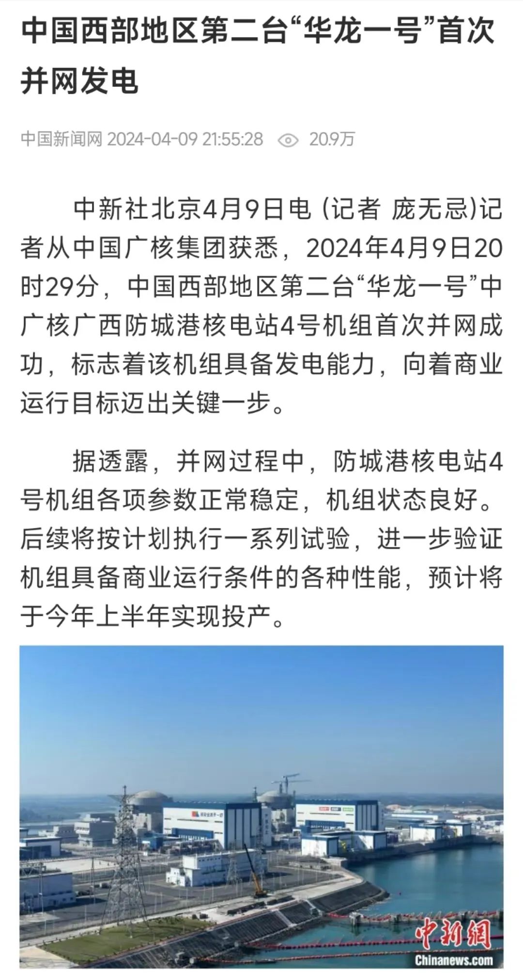 人民日報、新華社等主流媒體聚焦報道防城港4號機組首次并網(wǎng)發(fā)電